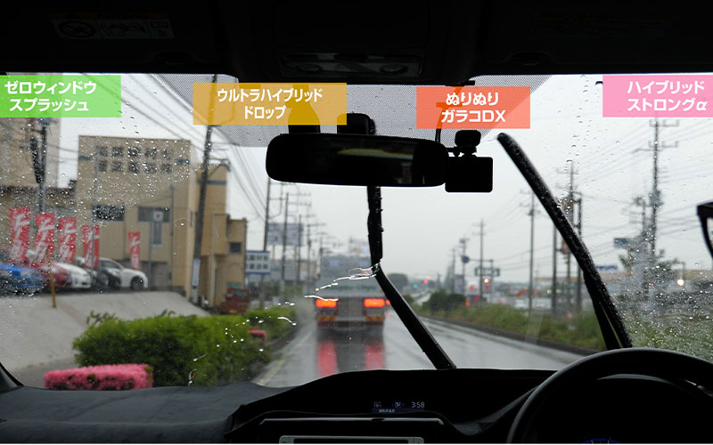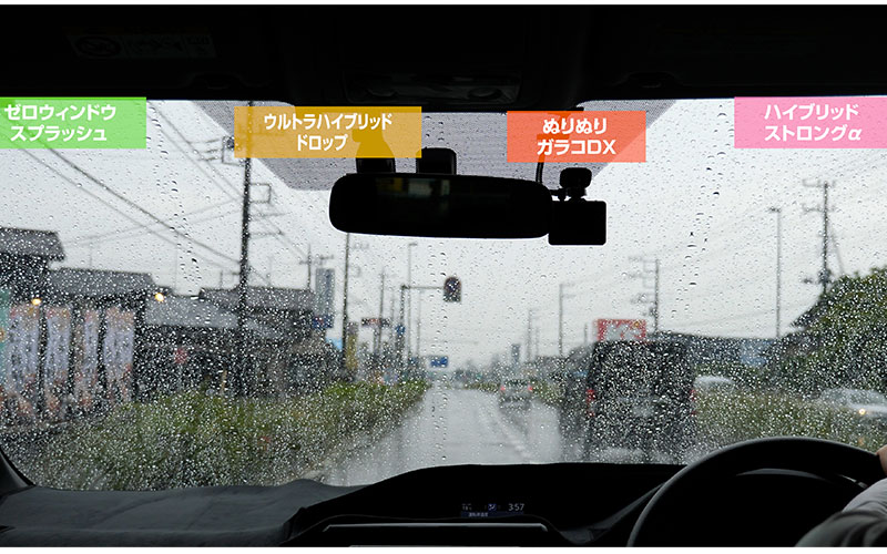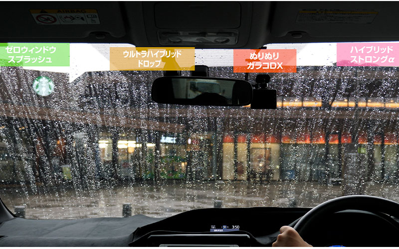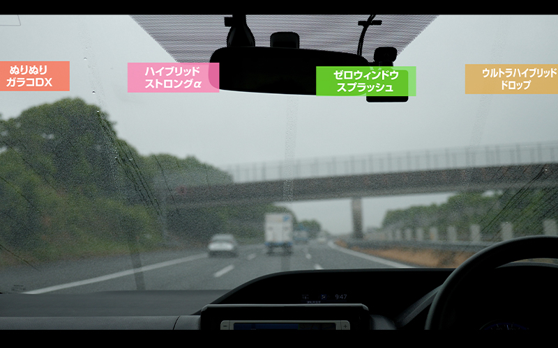 1番右上が1番水滴飛んでいっている。隣の『ハイブリッドストロングα』も飛んでいます。追い越し車線を走ると1番右が圧倒的に違うように見えます。