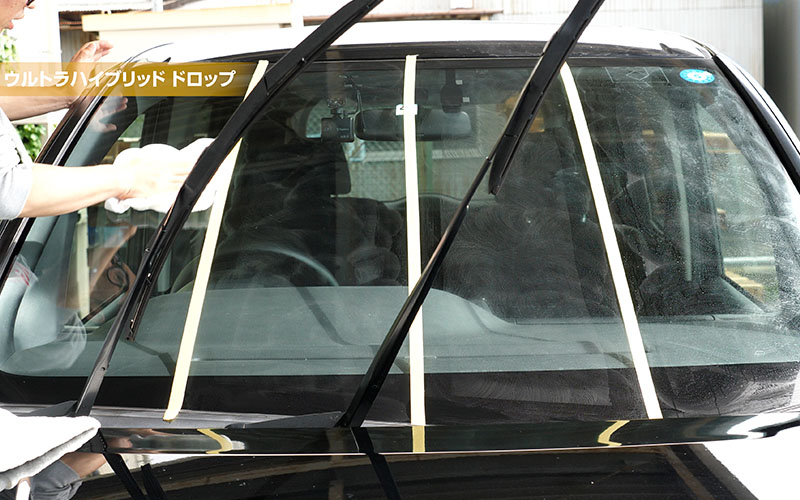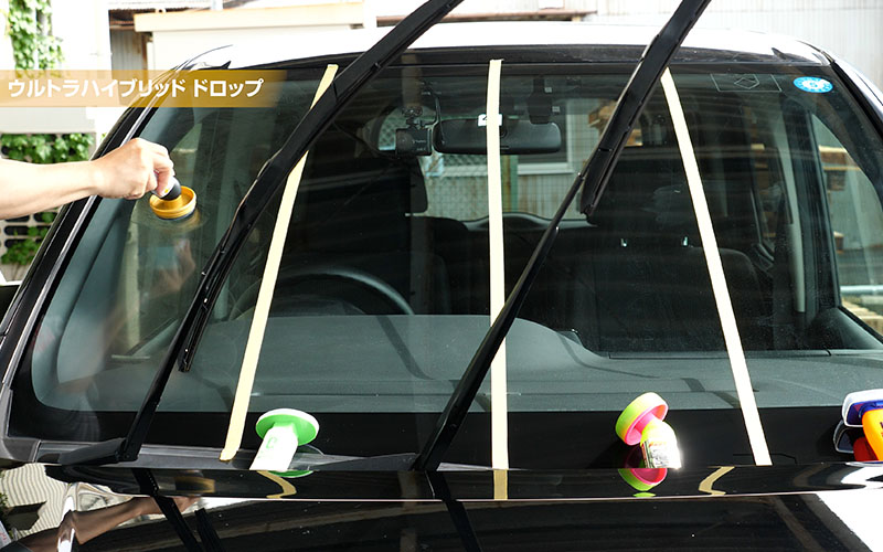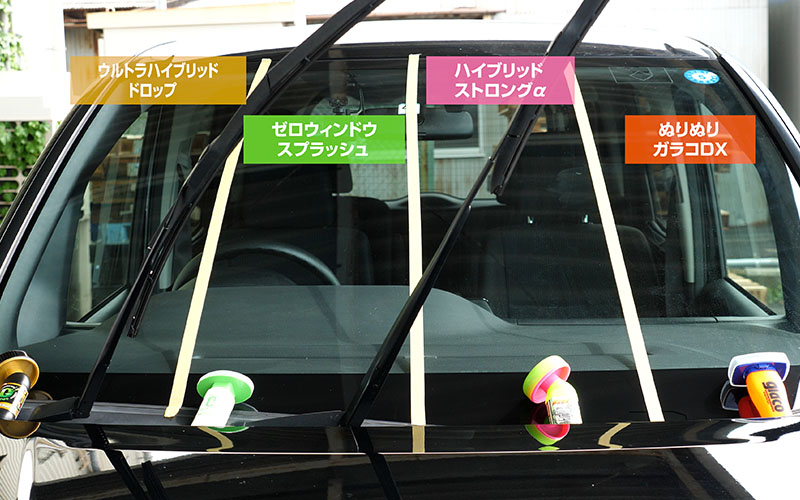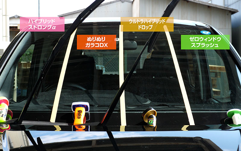 内側か外側かを変えたいので、運転席側左から、『ハイブリッドストロングα』・『ぬりぬりガラコDX』・『ウルトラハイブリッドドロップ』・『ゼロウィンドウスプラッシュ』の順番にしました。