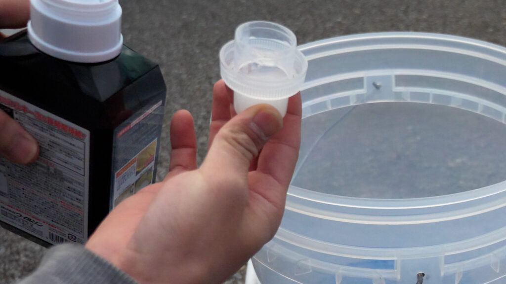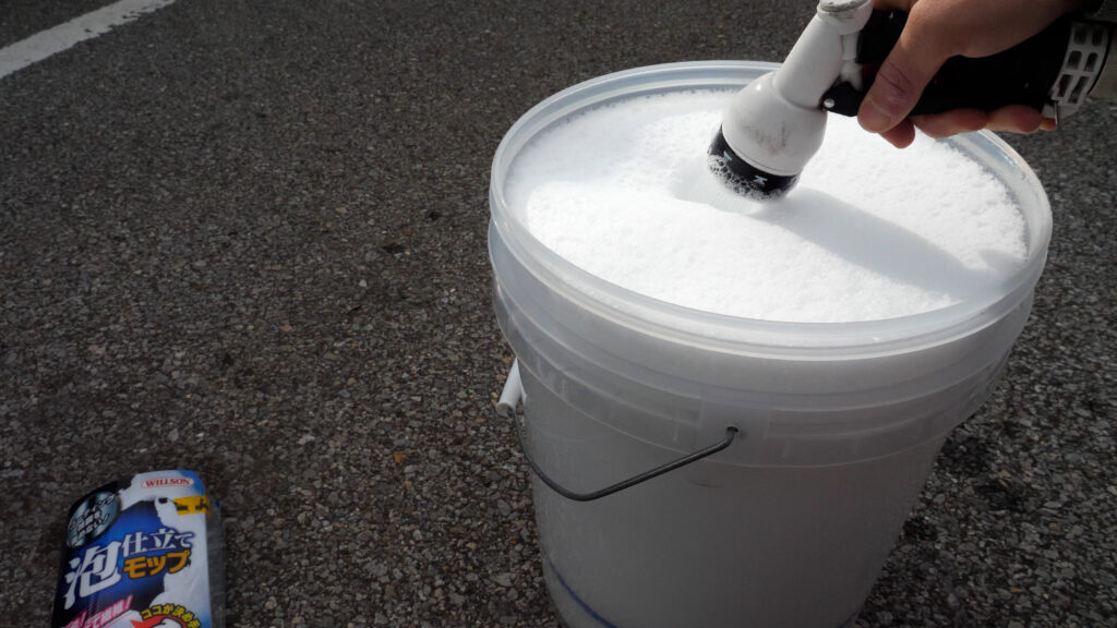 バケツの中に同メーカーのウィルソン泡仕立てシャンプーでカーシャンプーを作っていきます。
