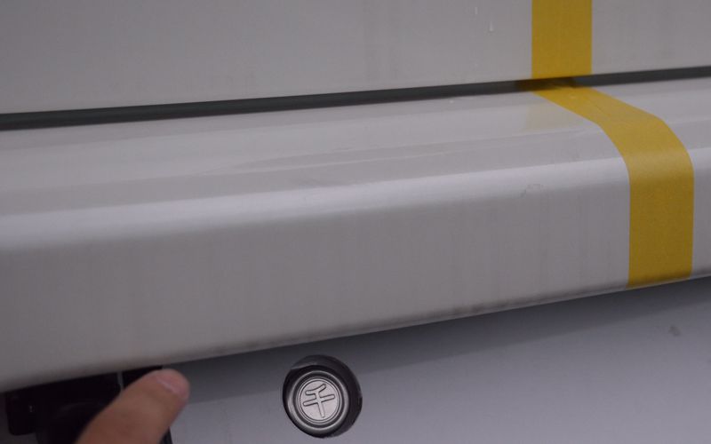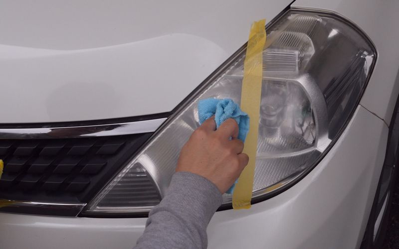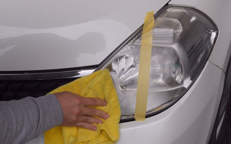 マスキングテープで未施工箇所と比較していきます。使い方は先ほどと同じです。くすんでいるところを軽く磨いていきます。
