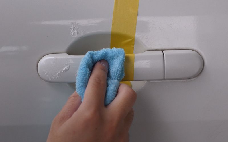 ①塗装面の汚れを洗い流し水分を拭き取ります。