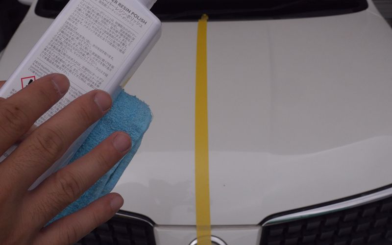 ボンネット半分を施工していきます。綿のタオルにスーパーレジンポリッシュを付けて円を描くように塗布していきます。
