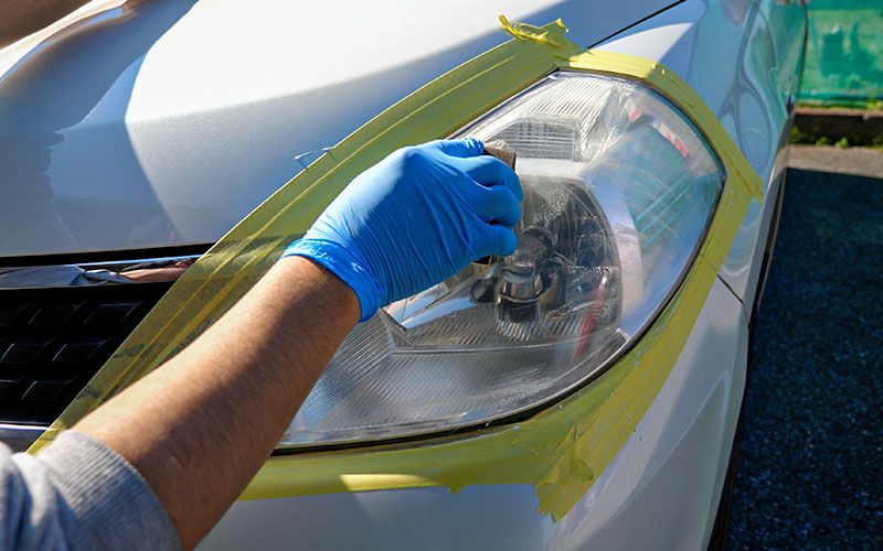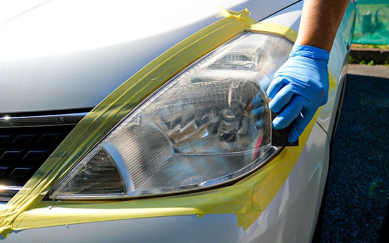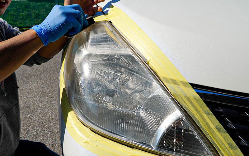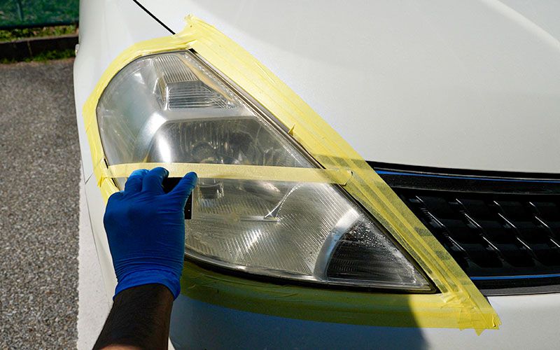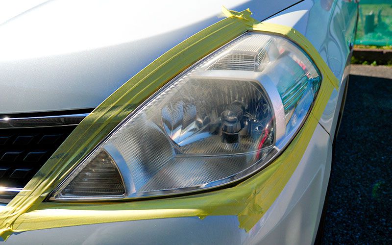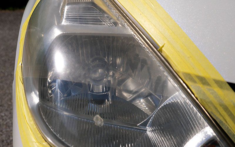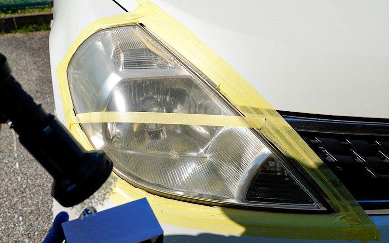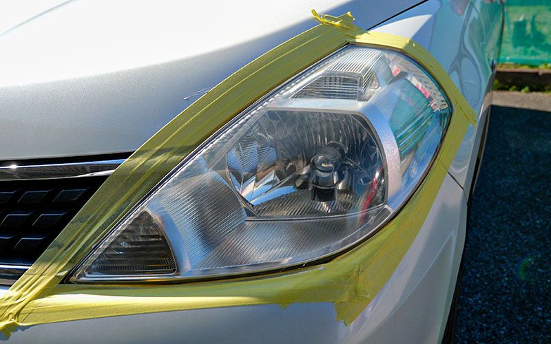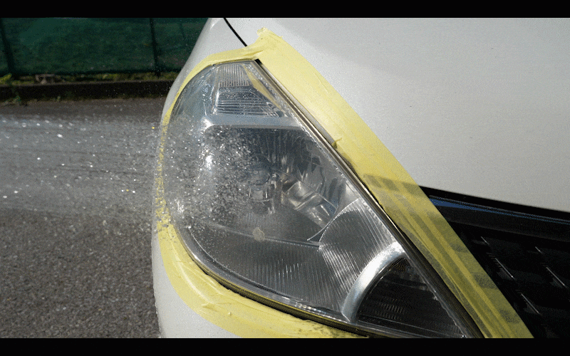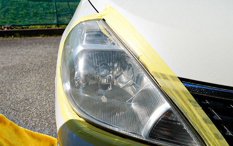 ヘッドライトをマスキングテープで2等分したので、まずは下半分だけ施工していきます。