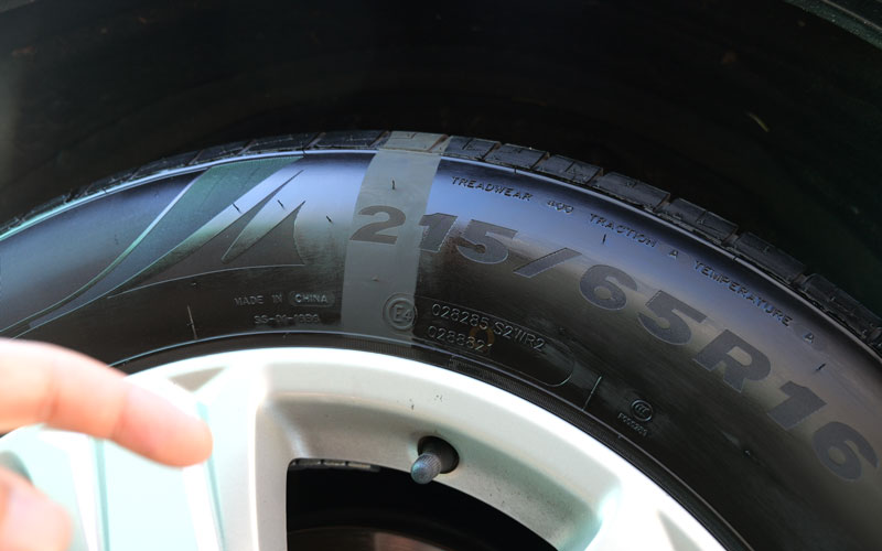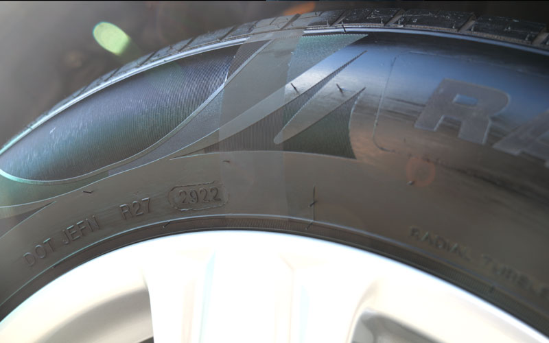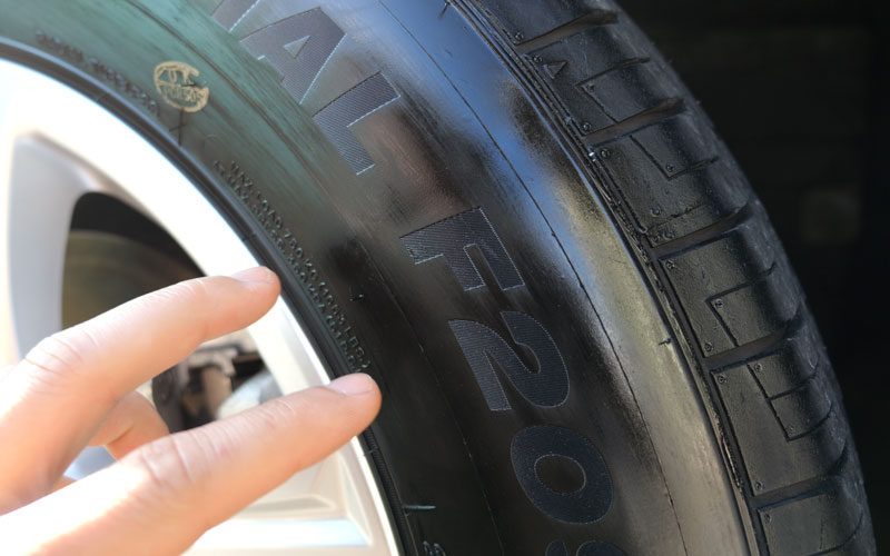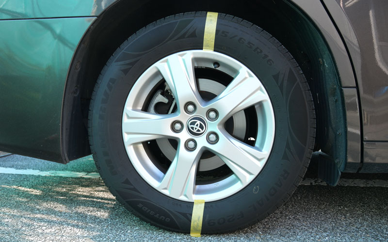 こちらがシュアラスターとジオセラミックタイヤコートを比較しているタイヤになります。マスキングテープの跡が上と下にありますで、右側がシュアラスター左側がジオセラミックとなっております。
