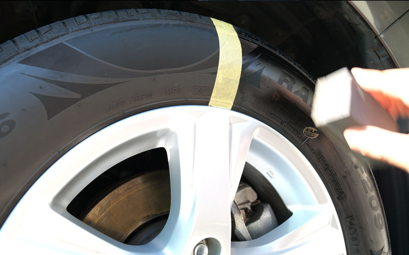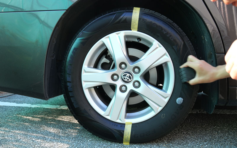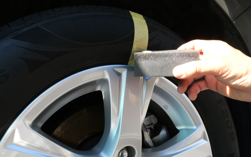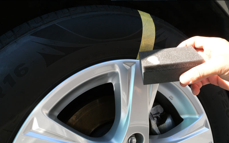 ②ボトルをよく振り専用スポンジの灰色面(柔らかい面)に液を適量取りタイヤ側面に均一に塗り伸ばす