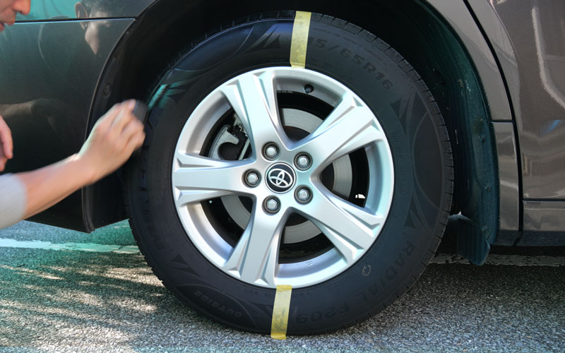 タイヤ自体は中性洗剤で洗いました。マスキングテープを貼ったところは未施工部分になるので、施工したところとの違いを見ていこうと思います。