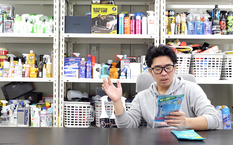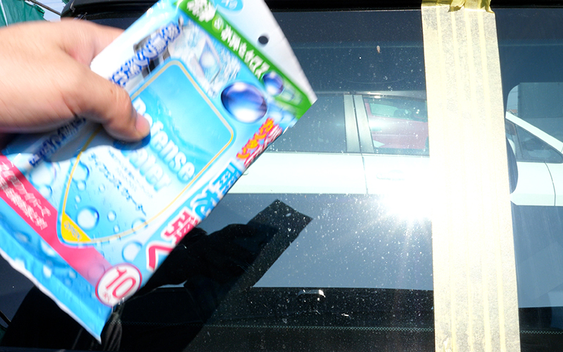 反対側の面にコメリの『ディフェンスウォーター』。金額は400円ぐらいで10枚入りです。シートも『スマートビューふくだけ撥水シート』と比べると少し厚めな感じがします。