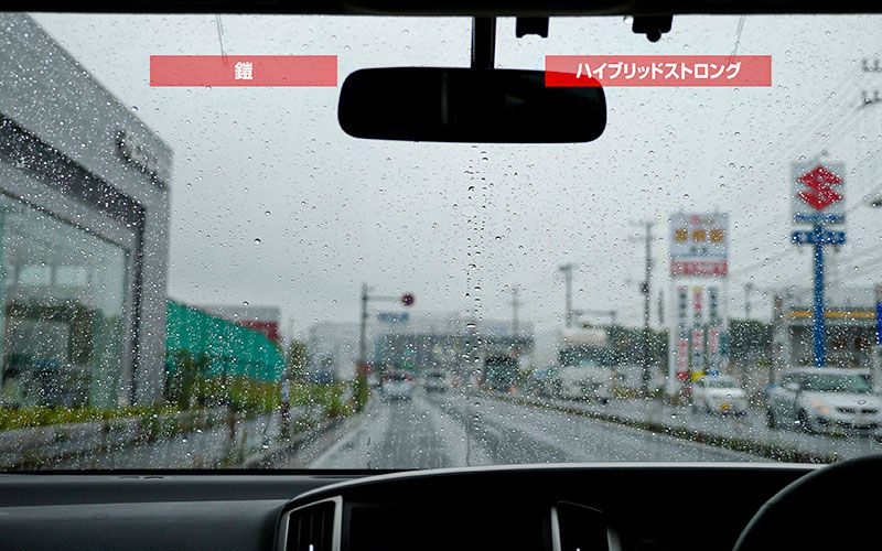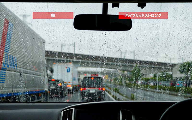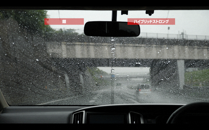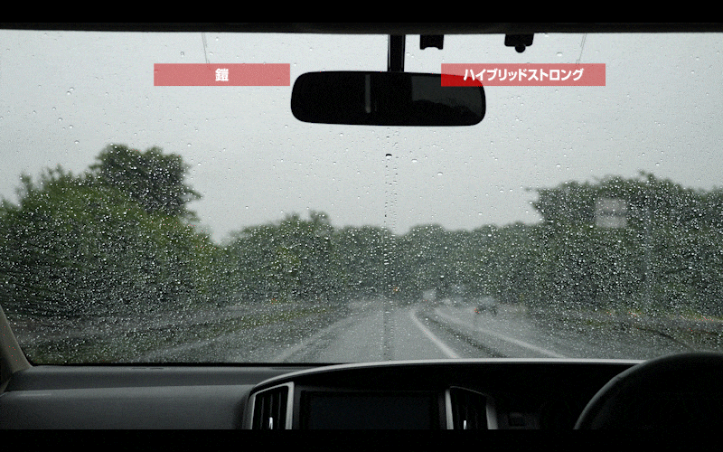 抜群の水はじき効果が長時間持続します。38km/h以上の走行速度でガラスに付着した雨・水滴が吹き飛ばされるので(当社研究部門風洞実験より)、ワイパーなしでも快適な視界が得られます。