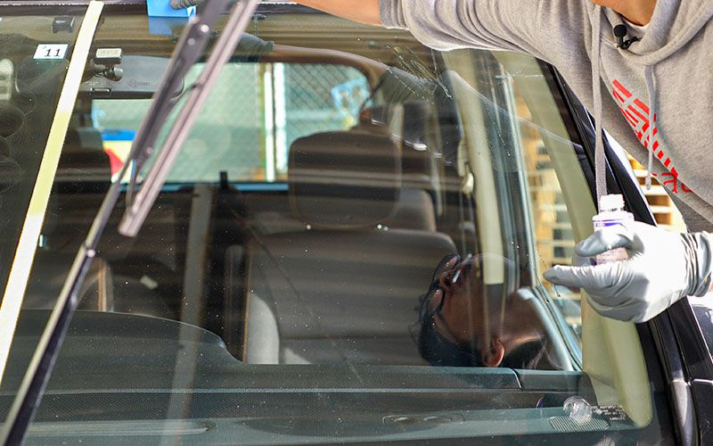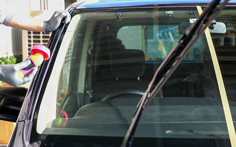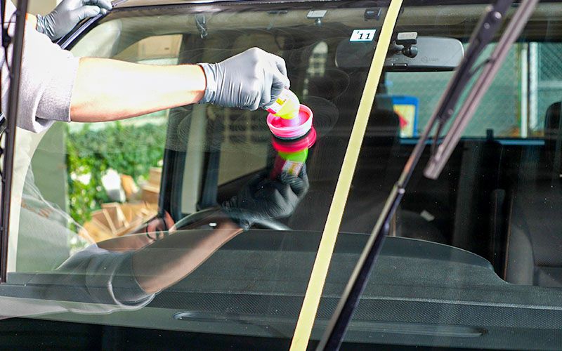 使用前にボトルをよく振り、フロントガラスの外面にヘッド部分を押し当てながら、ガラス面全体にムラなく塗布してください。