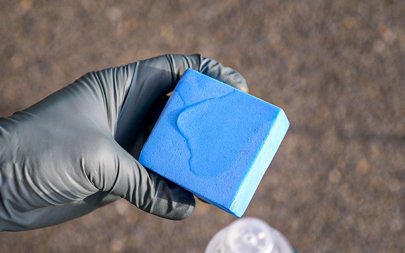 ③ガラス面が完全に乾燥しているか確認をしてください。付属のスポンジに鎧を2~3滴とります。
