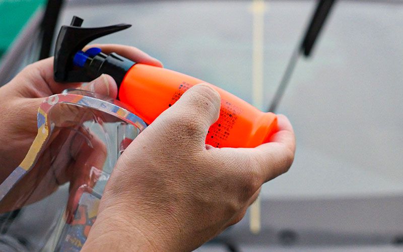 【2】ストッパーを解除し、30cm四方に1プッシュ程度スプレーします。※ガラスは乾いていても濡れていても使用OK!スプレーした液が人体にかからないように、風上からスプレーしてください。