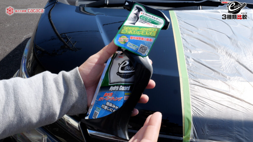 これが『ハイドロガード』という商品で、疎水性のボディコーティング雨ジミが付着しにくいセルフクリーニング効果雨で汚れが落ちる。