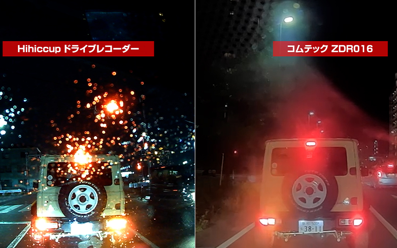 リアカメラの映像も一目瞭然ですね。左側の映像はヘッドライトが乱反射しているような感じでナンバーの確認がしづらいですが、『ZDR016』はヘッドライトに影響されることなくナンバーを確認することができました。