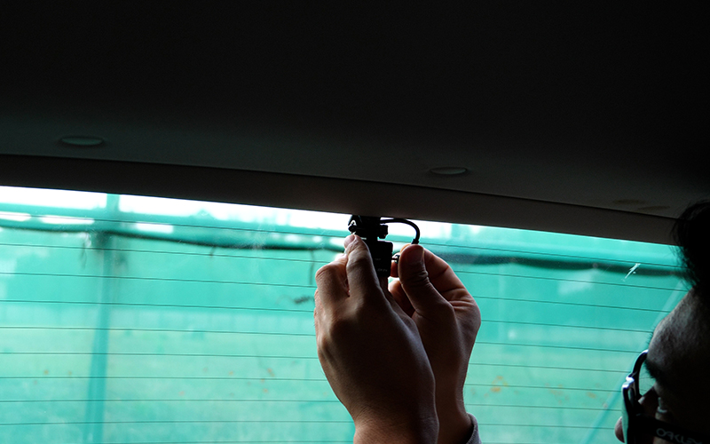 先に車の天井に配線を通してから、カメラを取り付ける位置をある程度決めます。