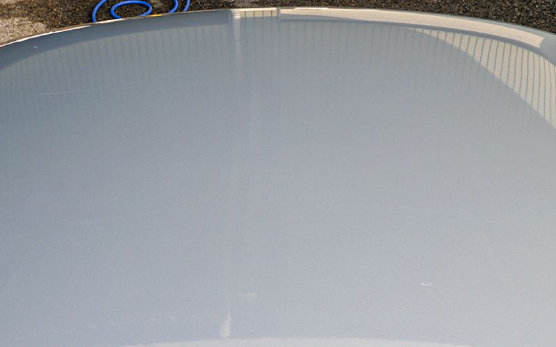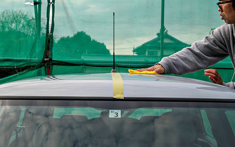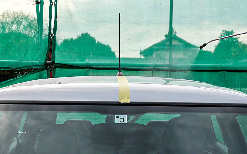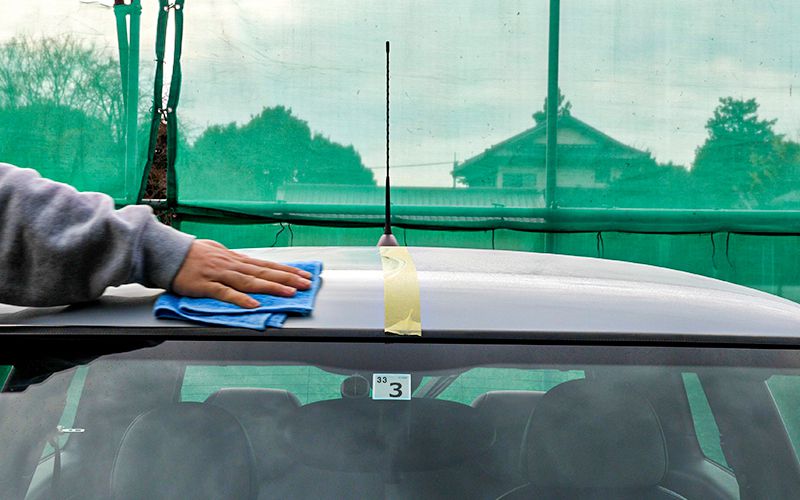 ちょっと順番を間違えてしまいました。水が垂れてしまうので先にルーフに施工すればよかった…とは思いましたが、噴霧器を使ってルーフにも施工していきます。まずは水がボンネットに垂れないように噴霧器でルーフを湿らせ、クロスで軽く拭きとりました。