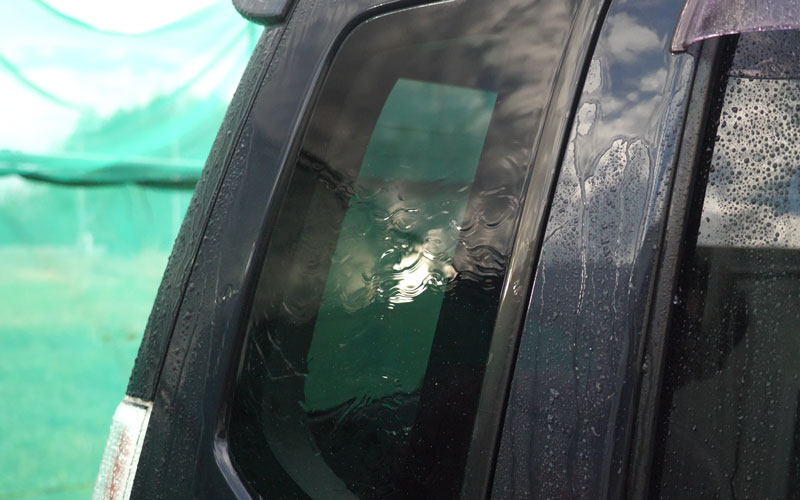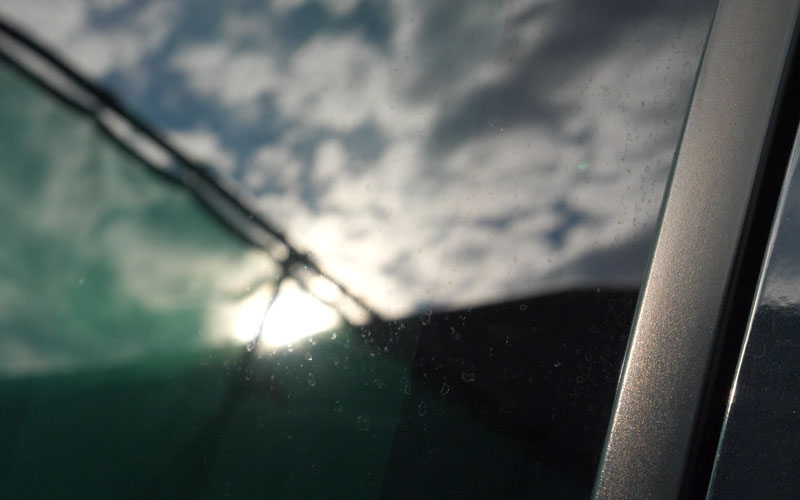 このように未施工の場合(左側)、ガラス面がモザイクのようになり前が見えにくくなるので、定期的に撥水剤を施工することをオススメします。
