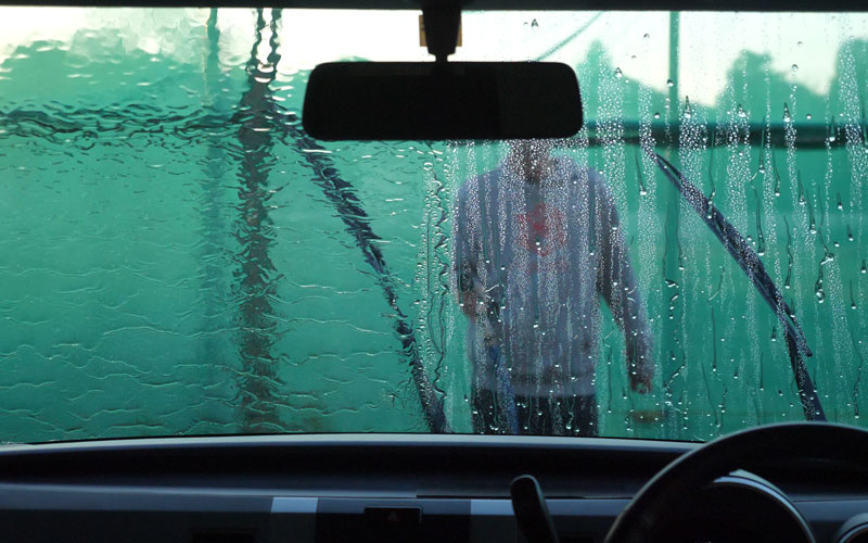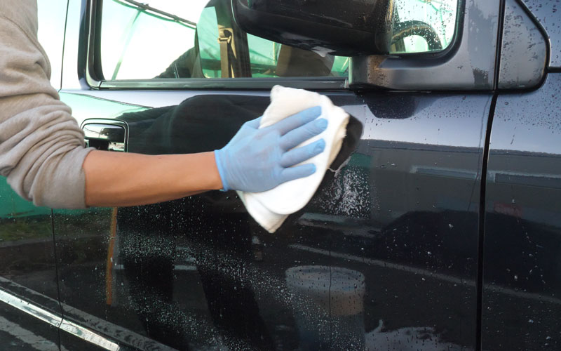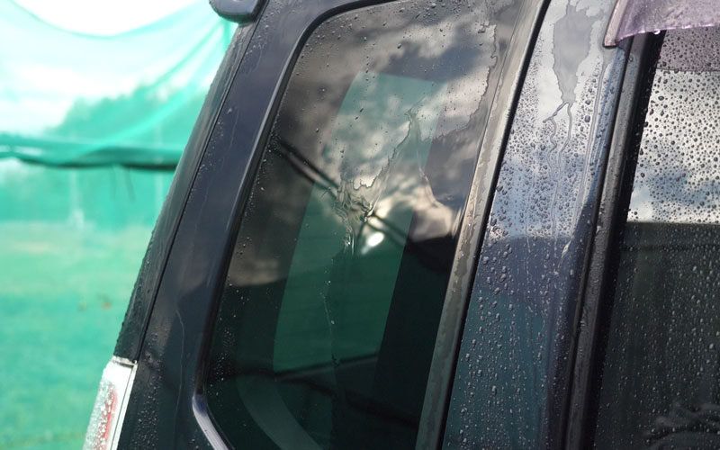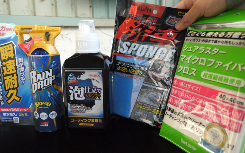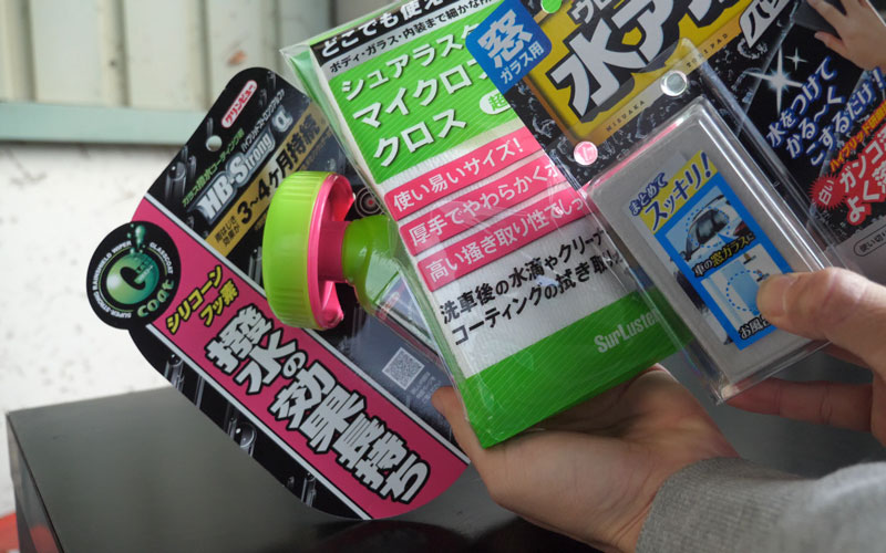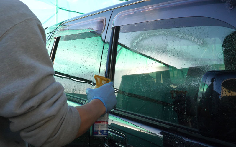 車を洗い終わったらソフト99の『レインドロップ(簡易コーティング剤)』を使っていきます。この商品の良いところは窓ガラスやドアバイザーなど、どこにでも使えるところです。