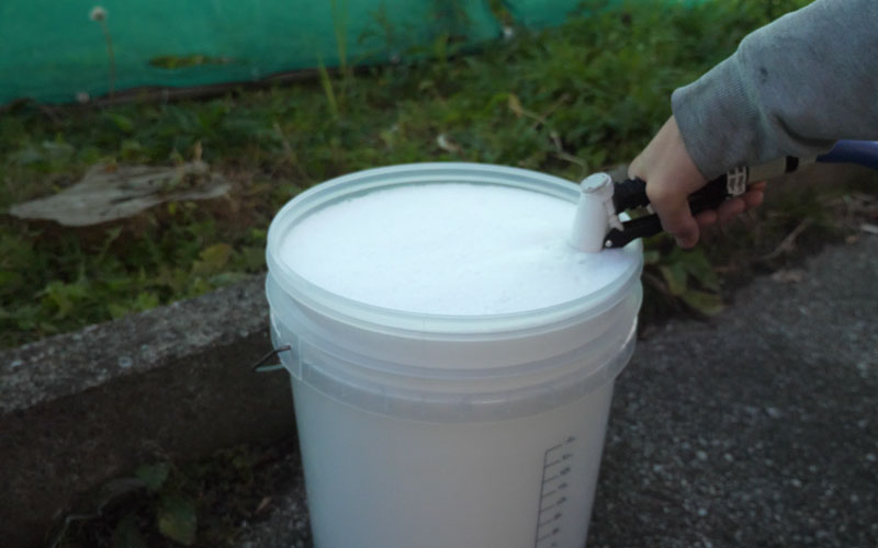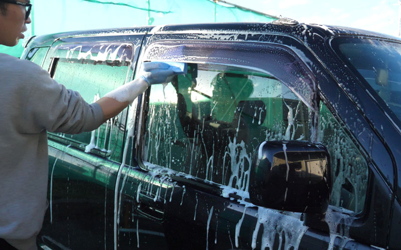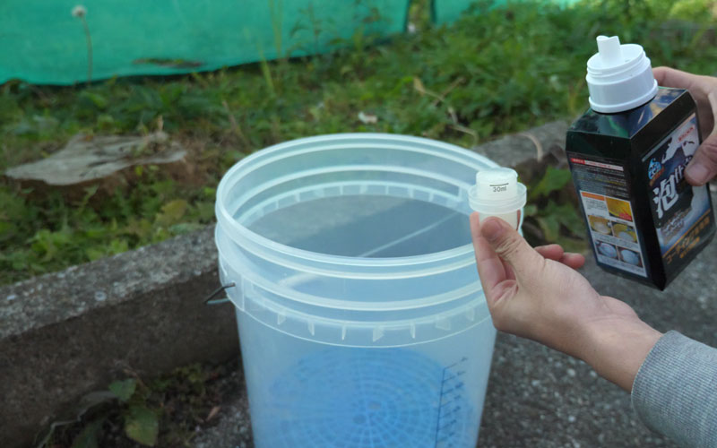 まずはウィルソンの『泡仕立てシャンプー』を使って車を洗っていきます。泡仕立てシャンプーの良いところは匂いと、濃縮なのでキャップからこぼれにくいところです。
