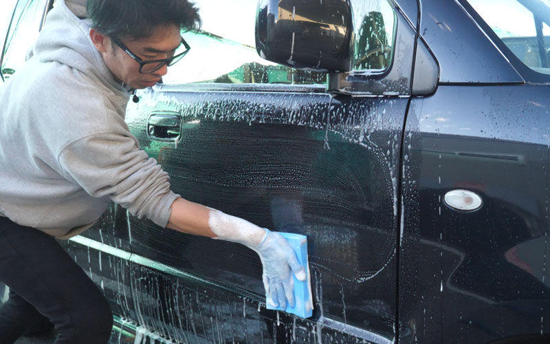 カーシャンプーを泡立てたらアイオンの『洗車スポンジ』を使って洗っていきます。