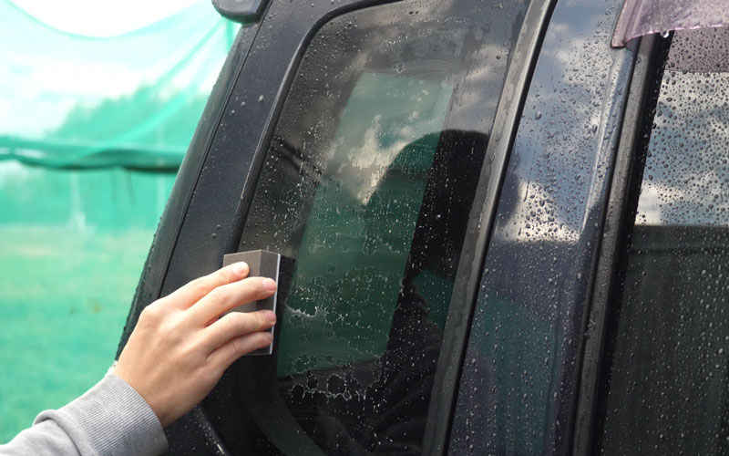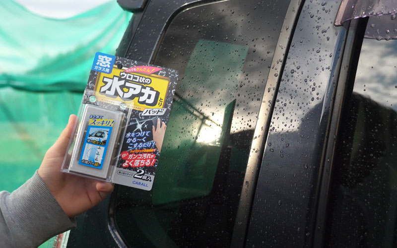 まずは『水アカとりパッド』から使っていきます。この商品はガラス付着している汚れ(水アカや油膜)を除去する商品になります。ガラス用の撥水剤を使用する前に使っておくことで水の流れ(水弾き)も変わってくるので、下地処理としてオススメです。