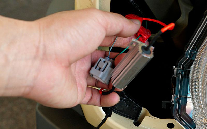 続いて、車両側に50W60Ωの抵抗器を取り付けます。そうしないとハイフラ※を起こしてしまうので、この作業は必ず行ってください。