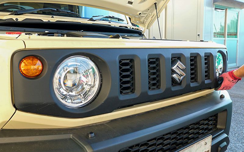 ジムニーシエラの純正ウインカーレンズはオレンジ色で、ハチの巣みたいですね。こちらをクリアのウインカーレンズに交換していきます。