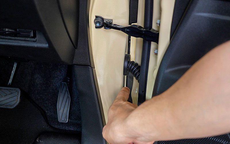 ドアパネルを外します。こういう後付けのドアポケットとか訳の分からない物が付いていたらディーラーの人も面倒くさいだろうな…。