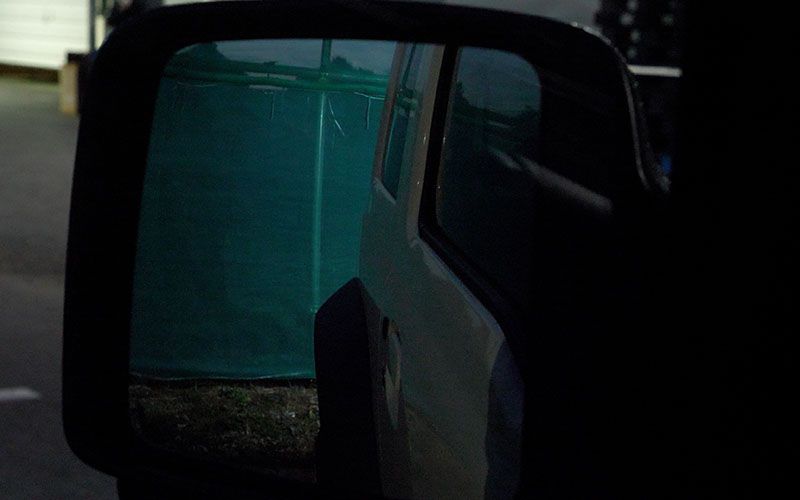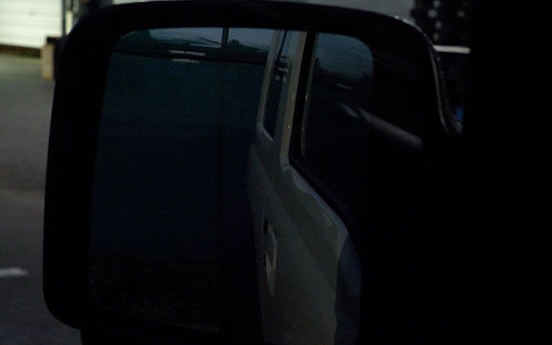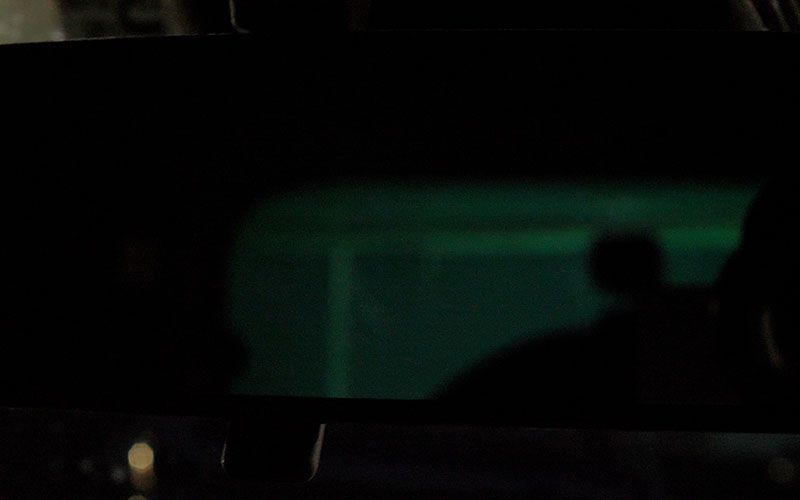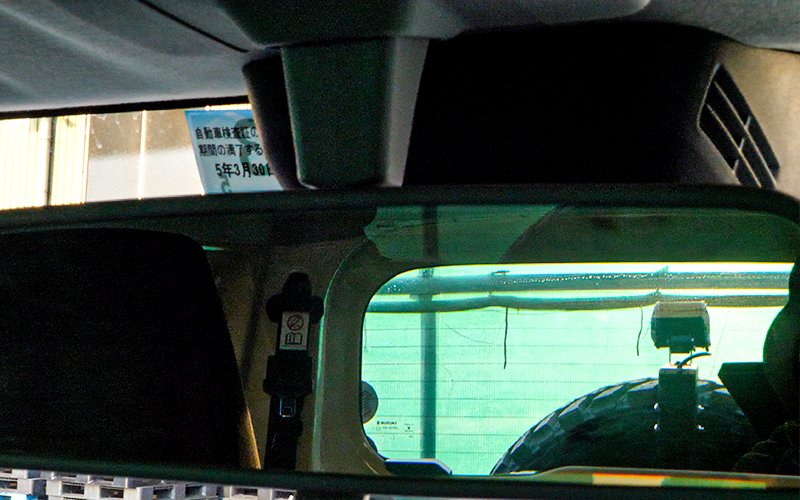 ルームミラーからの見え方はこんな感じです。そもそもタイヤが窓に被っていたので、今回のライト1つがメチャメチャ気になるような感じではありませんでした。