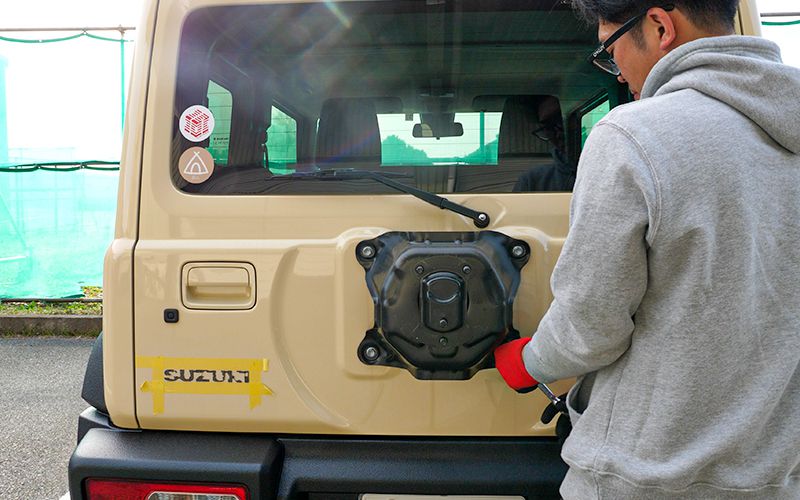 スペアタイヤを外していきます。僕の場合ちょっと問題なのが、タイヤサイズを変えてあるので、普通よりスペアタイヤが大きくなっています。……付くのだろうか。心配です。