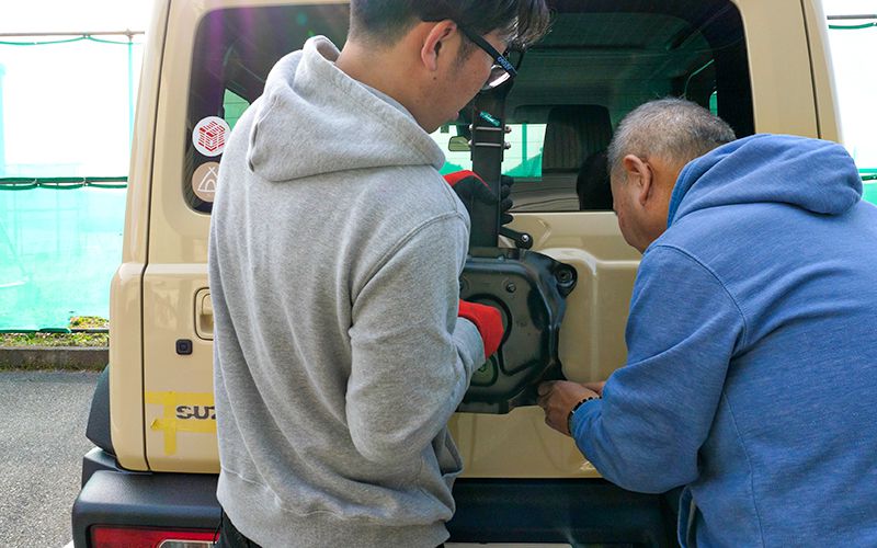 タイヤラック部分もなかなか重量があるため、一人で作業するのは大変です。今回は旅人のガヤさんに手伝ってもらって取り付けました。