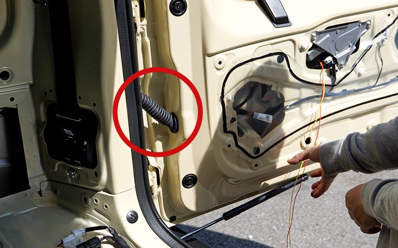 ラゲッジ内に配線を引き込む際にはドアについているチューブ内を通る必要があります。配線通しを使ってチューブの中を通すのですが、ブチルで固定されているビニールを一度めくると通しやすくなります。【画像】