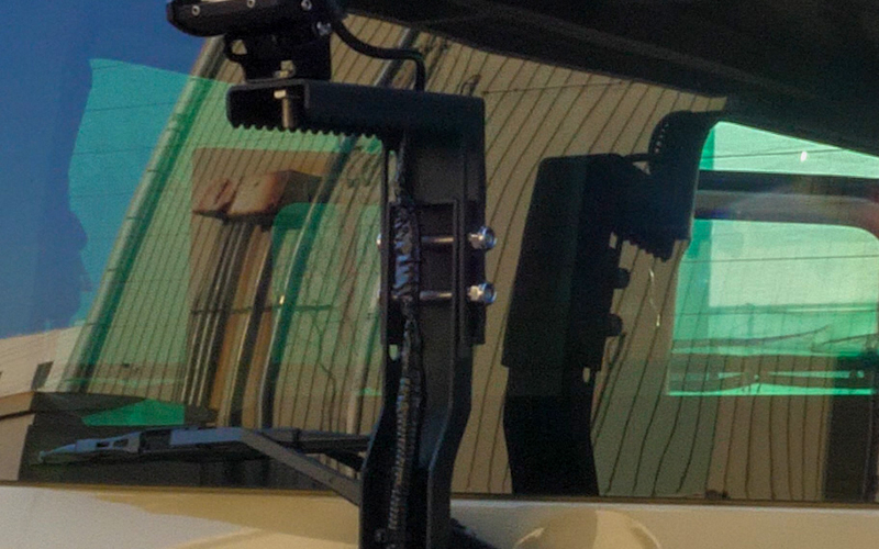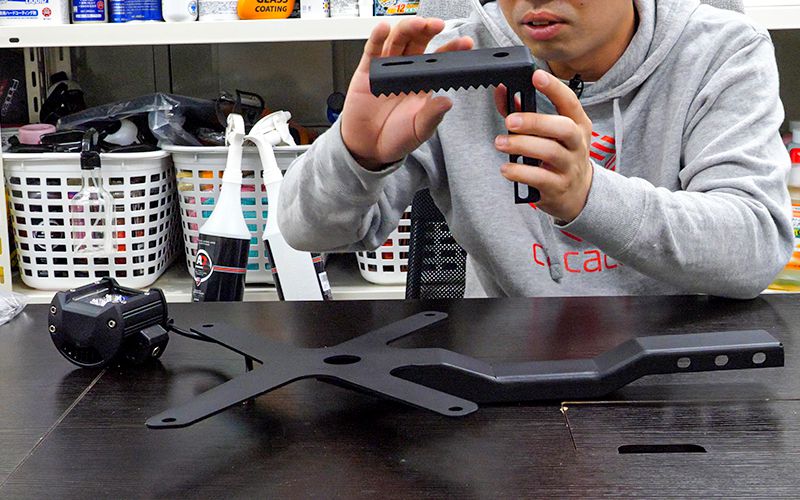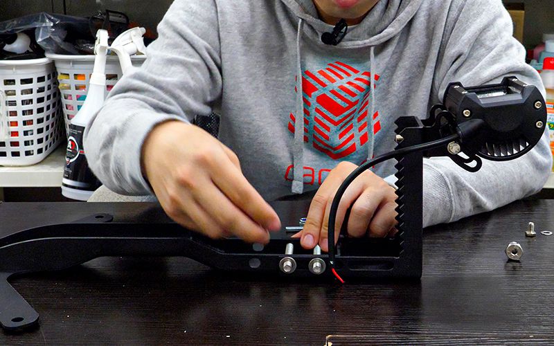 タイヤラックの後ろにライトを取り付けた状態で、ボルトを締めていきます。