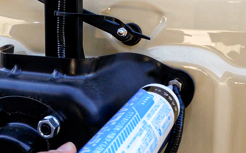配線の引き込みに使った中空ボルトと配線チューブの間部分はシリコンシーラントでコーキングしました。これで車内に水が入る心配もなくなったと思います。