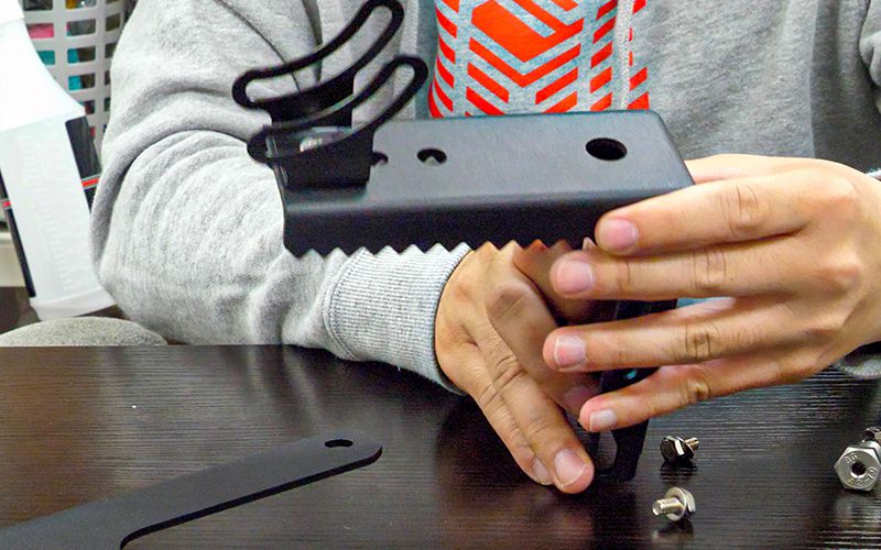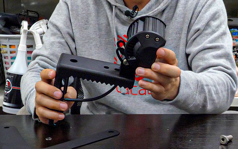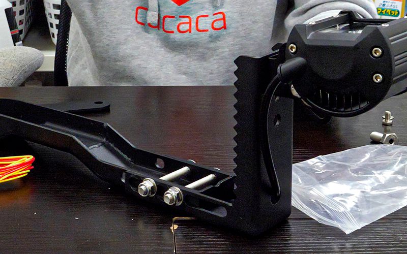 ①L字のパーツのギザギザ部分を上に向け、その上にライト台座部分を取り付けます。※ラチェットと13mmのソケットを使用します。