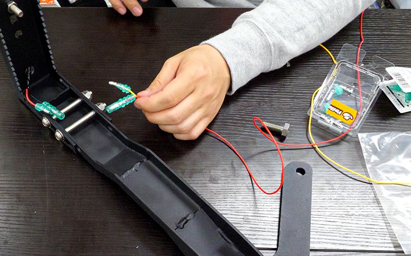 ライトとタイヤラックの取り付けが終わったら、中空ボルトの穴の中に配線をどんどん入れていきます。