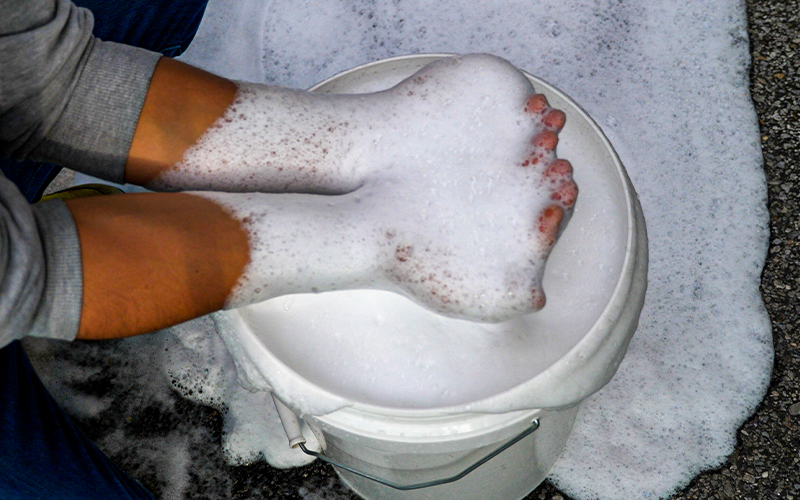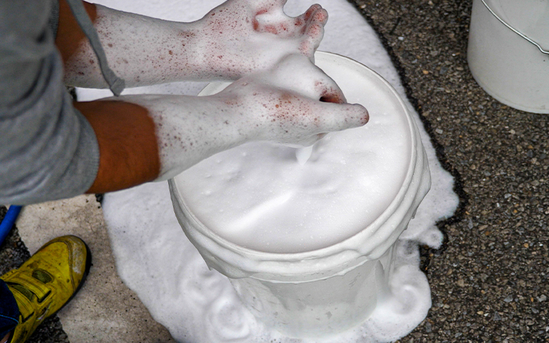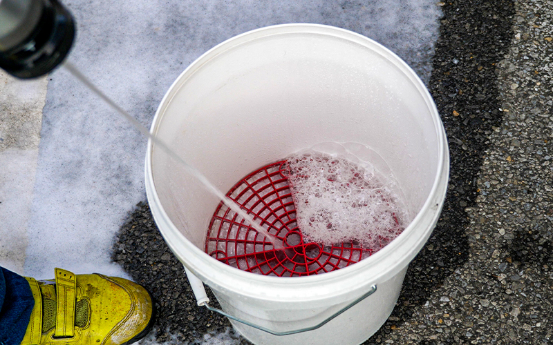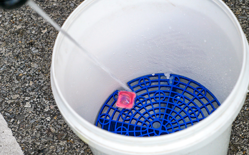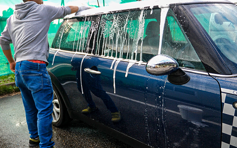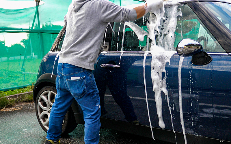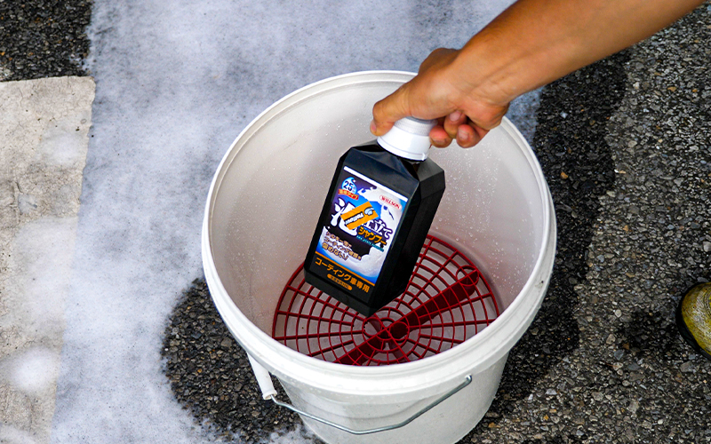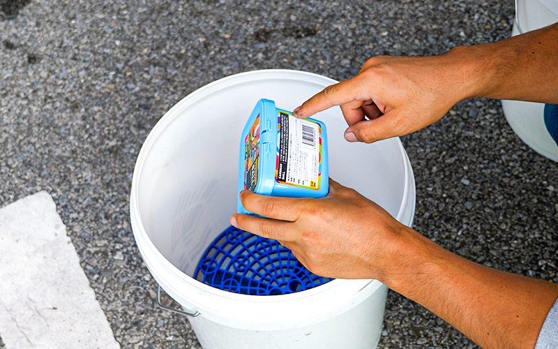 ※溶け残る場合はよくかき混ぜるか、潰す。 - シャンプーが完成したら、通常の要領で洗車をしていき、たっぷりの水で洗い流す。