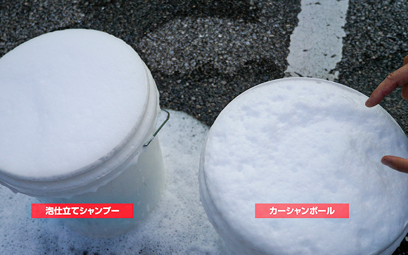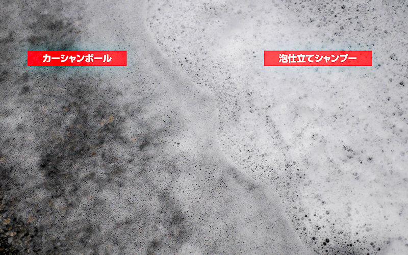 比較してみて思ったのですが、『カーシャンボール』の泡立ち方は、スパシャンのコーティング剤やモノタロウの『撥水シャンプー』のような撥水成分を多く含んでいるシャンプーに近い感じがします。