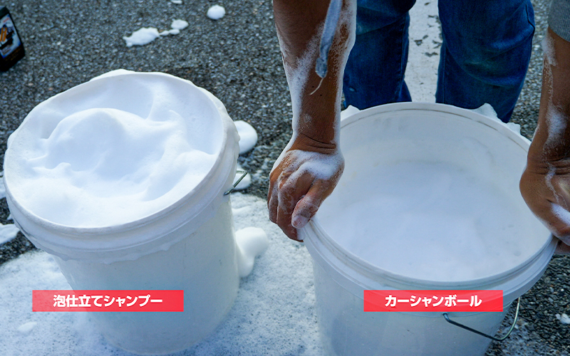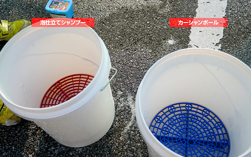 左側のバケツに『泡仕立てシャンプー』、右側のバケツに『カーシャンボール』を入れて、同じくらいの高さから水を入れて泡立てていきます。