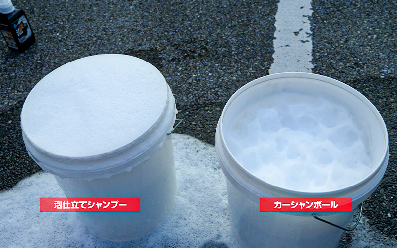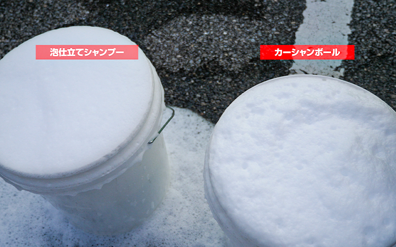 先に『泡仕立てシャンプー』、後から『カーシャンボール』の泡を立ててみました。今回は水の量を8Lに変えて濃い目に作ってみましたが、どちらもバケツから溢れるほどの泡が立ちました。