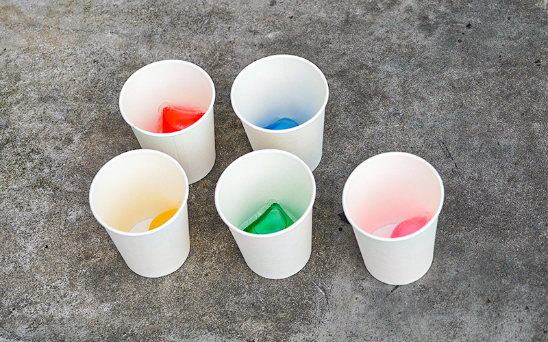 紙コップに1個ずつ違う色の『カーシャンボール』と水を入れて匂いを嗅いでいきます。