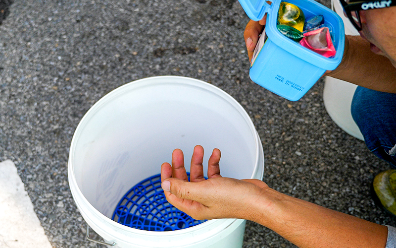 変な匂いはありません。バケツにカーシャンボールを投入して水を入れていきます。