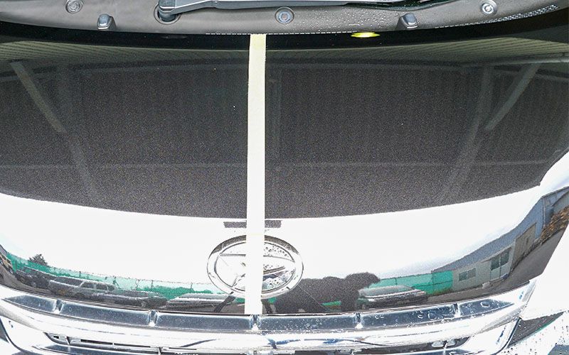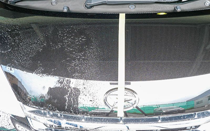 マスキングテープでボンネットを2等分して、『レインドロップ』と『コーティング剤B-01』を半分ずつ施工していきたいと思います。