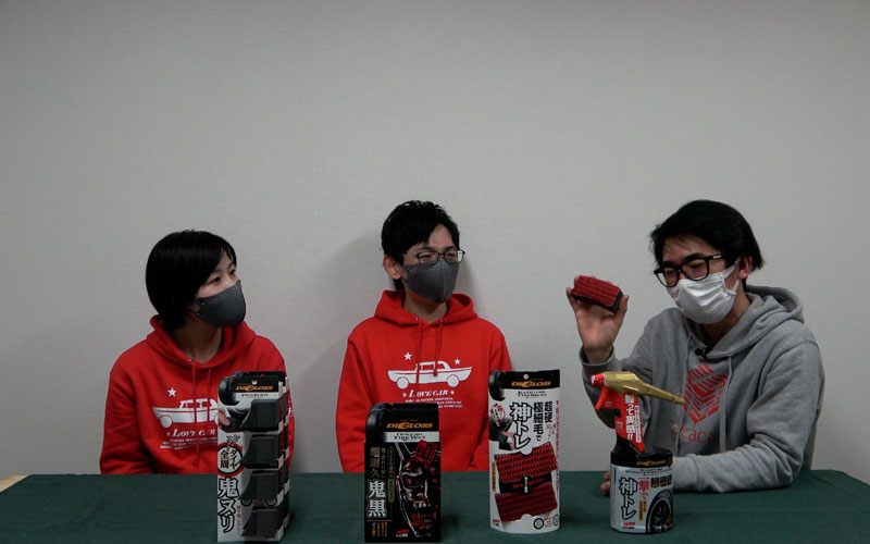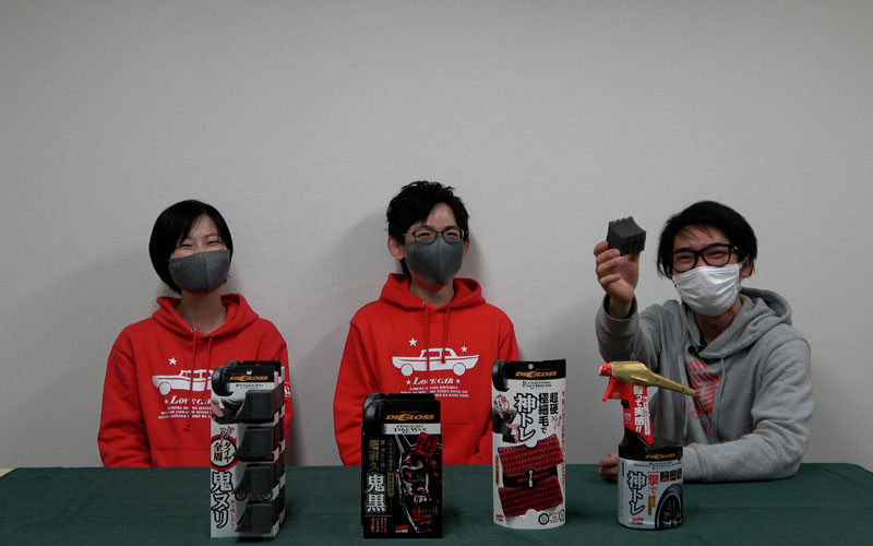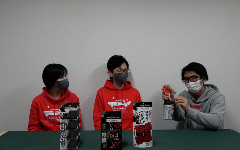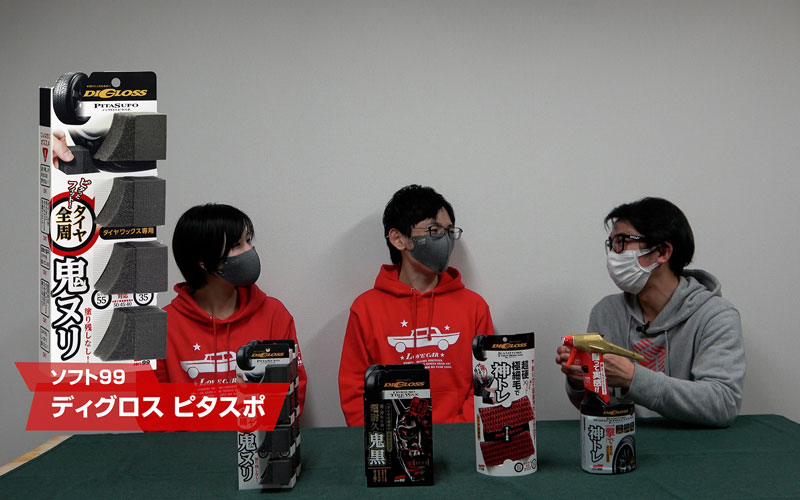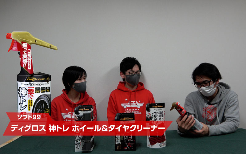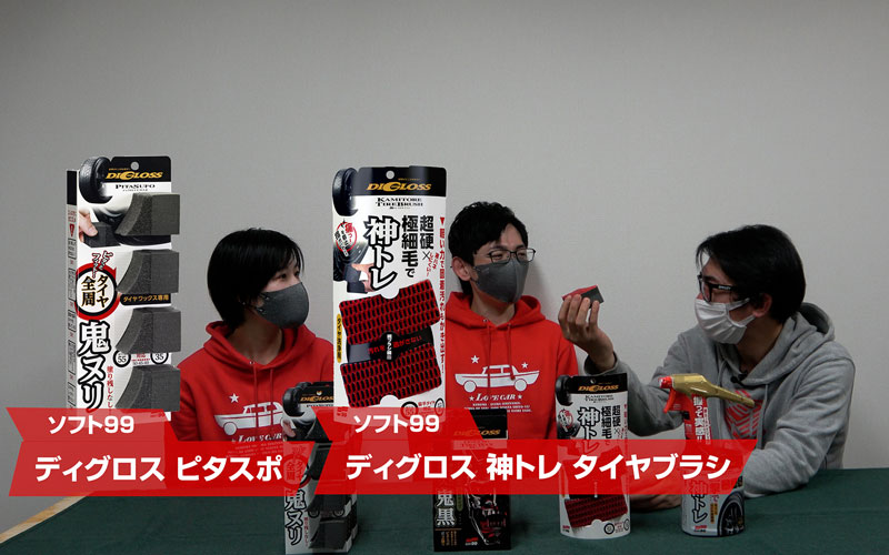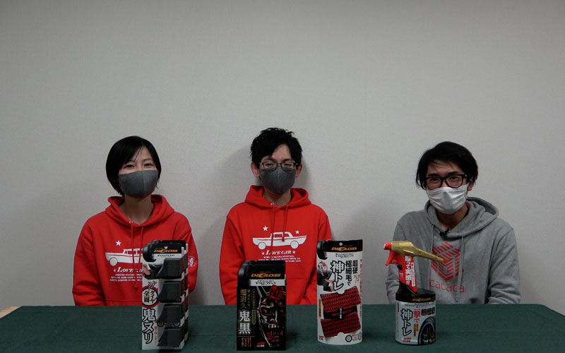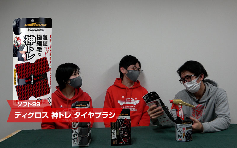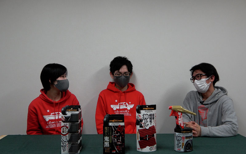 溝口さん:というわけで、今日は4つも新商品持ってこさせていただきました。簡単にさせていただきますと、右側からタイヤとホイールを洗う超強力クリーナー「ディグロス 神トレ ホイール&タイヤクリーナー」、続いてタイヤ専用ブラシ「ディグロス 神トレ タイヤブラシ」次がタイヤを真っ黒にする「ディグロス 鬼黒 タイヤワックス」最後がタイヤワックス専用の「ディグロス ピタスポ」の4つを持ってこさせていただきました。