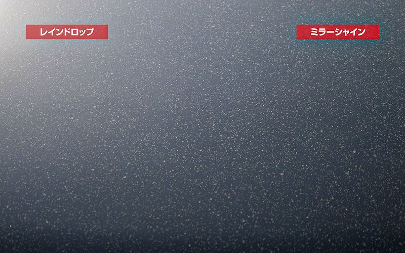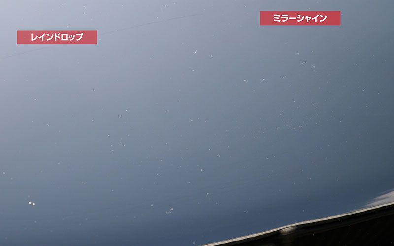 汚れの付き具合を比較すると、『レインドロップ』施工面は粒が小さく比較的汚れが少なめなのに対し、『ミラーシャイン』施工面は粒が大きめで少し汚れが多めに見えます。