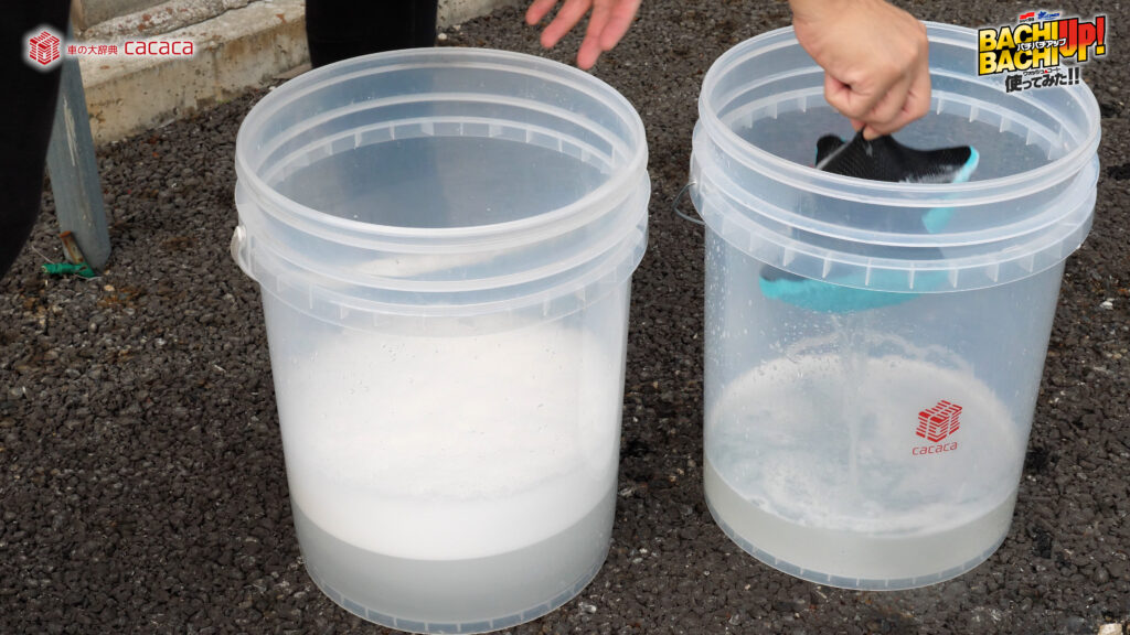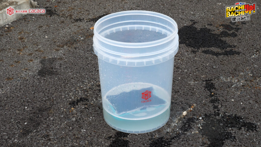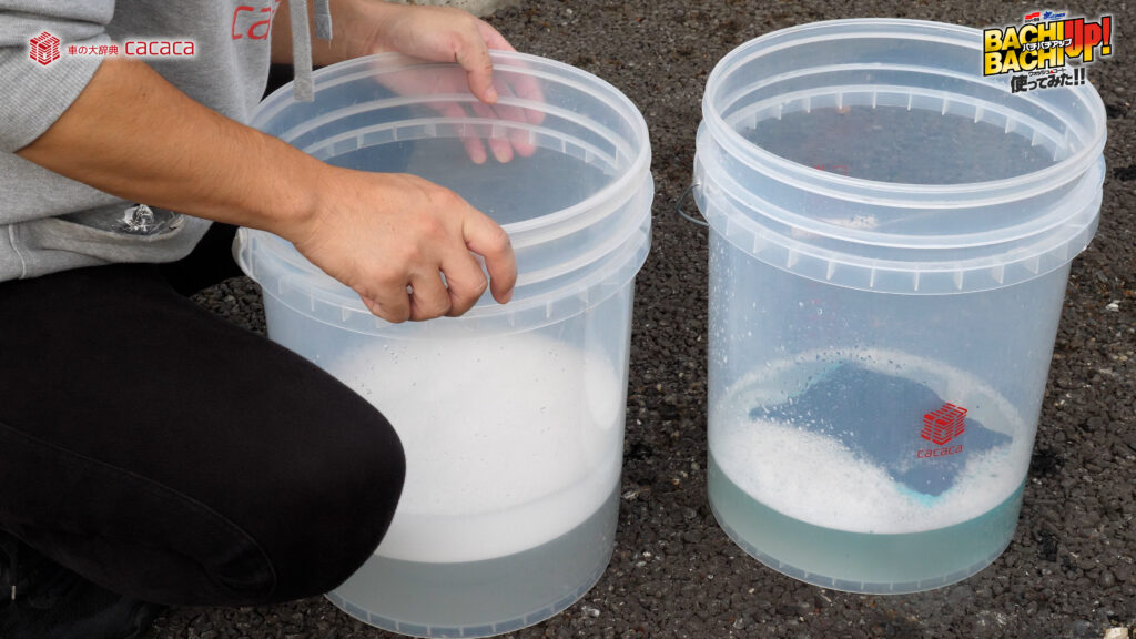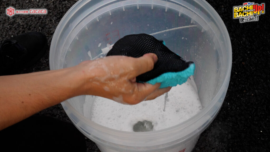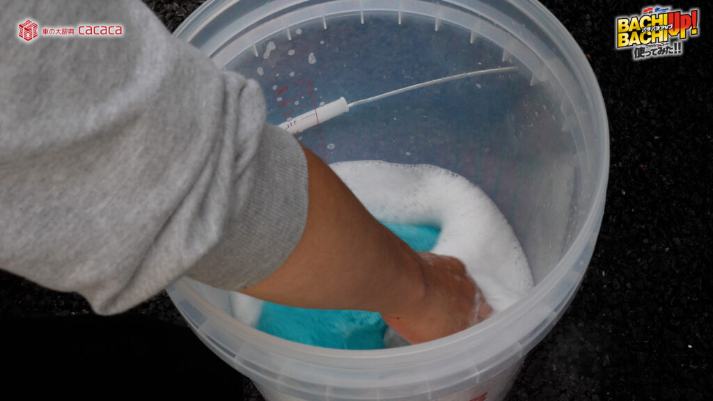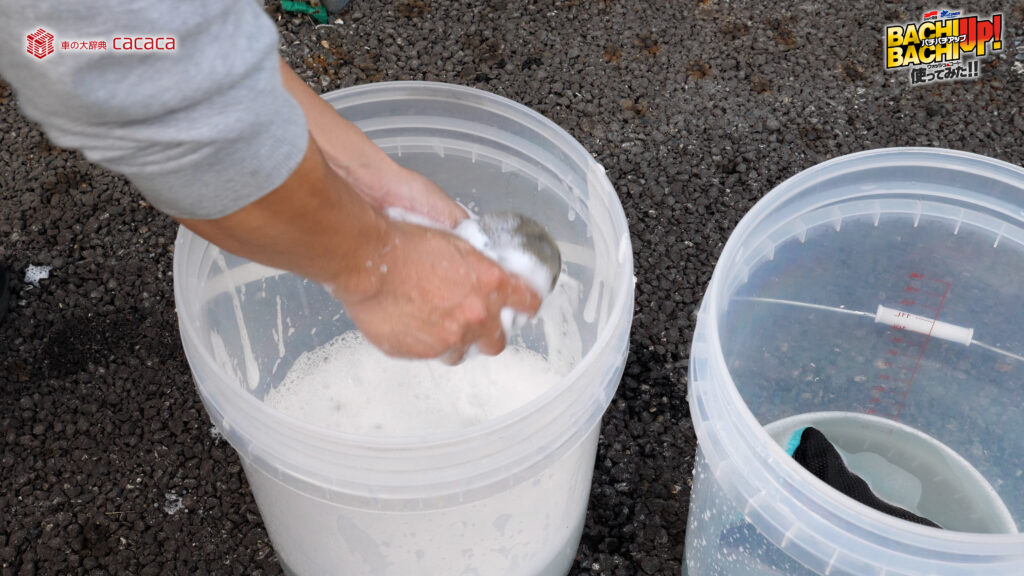※勢いよく水を注ぐことでより泡立ちます。 - ②スポンジやクロスなどにバケツ内の液を含ませ、ボディガラスに塗り込むように洗って下さい。