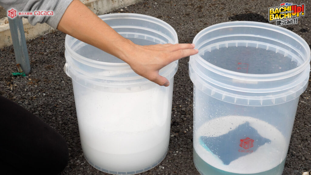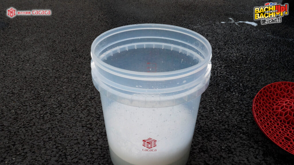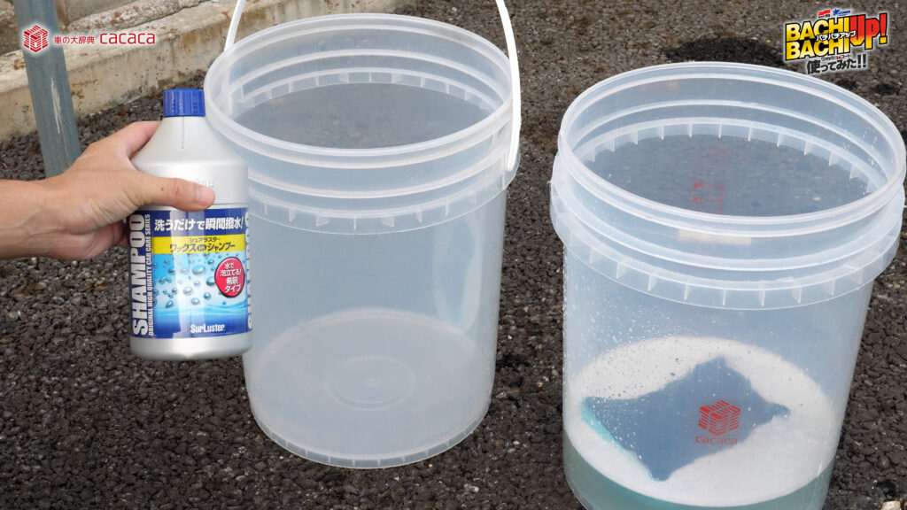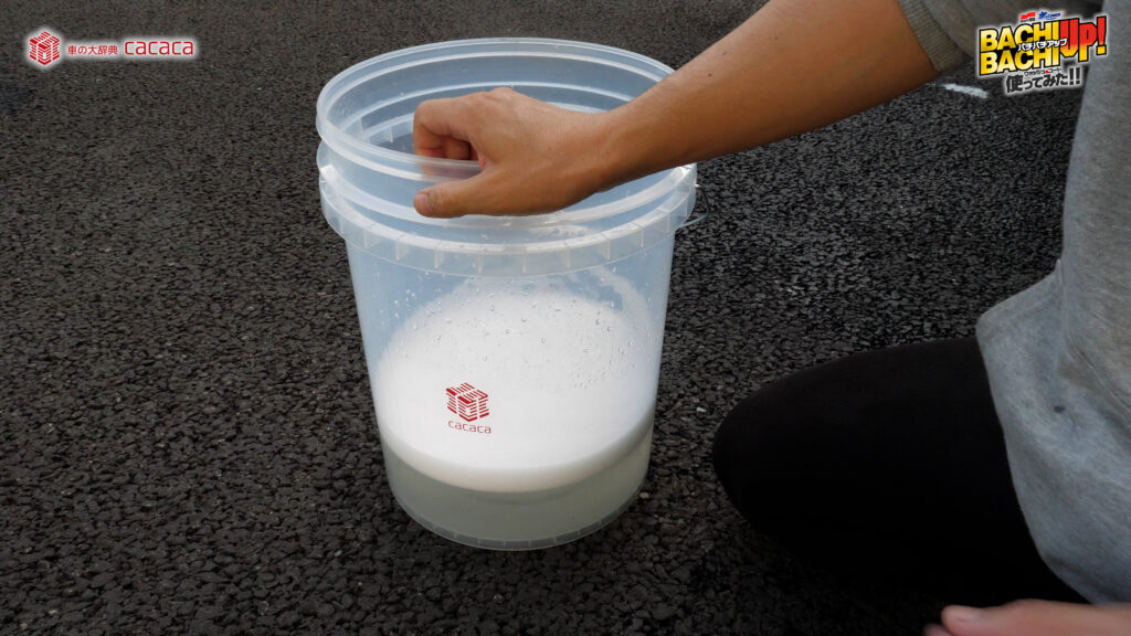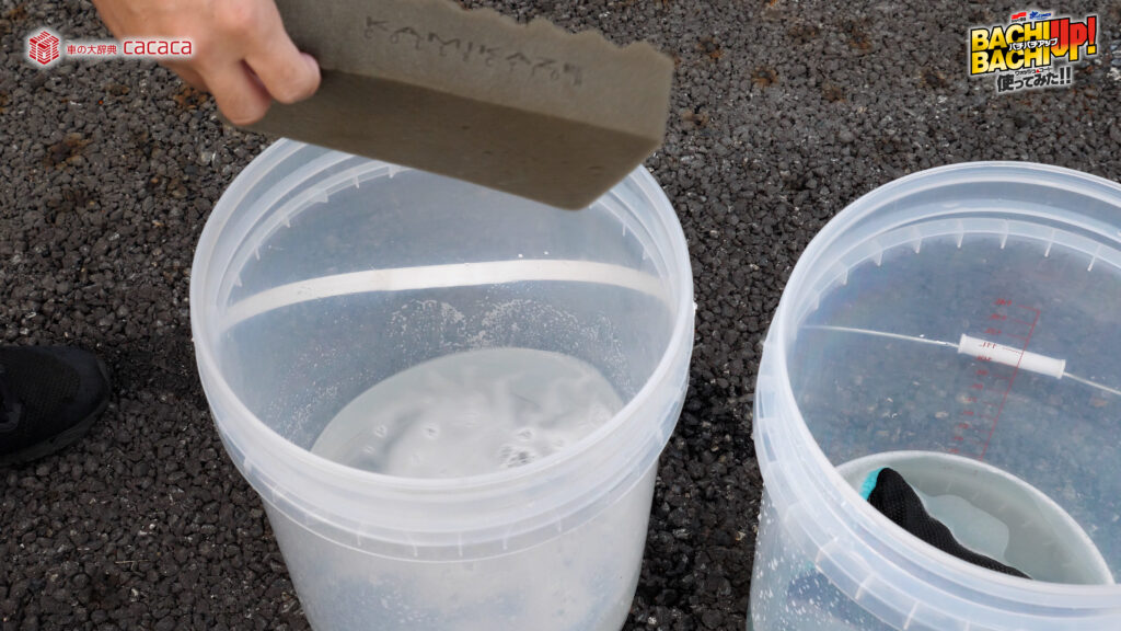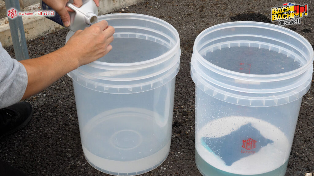 ※勢いよく水を注ぐことでより泡立ちます。 - ②スポンジやクロスなどにバケツ内の液を含ませ、ボディガラスに塗り込むように洗って下さい。