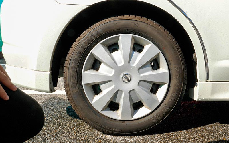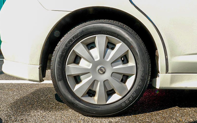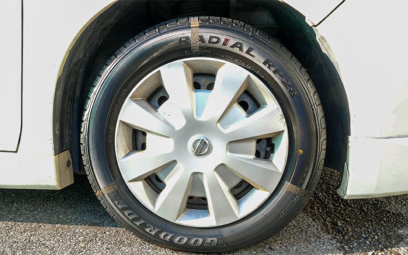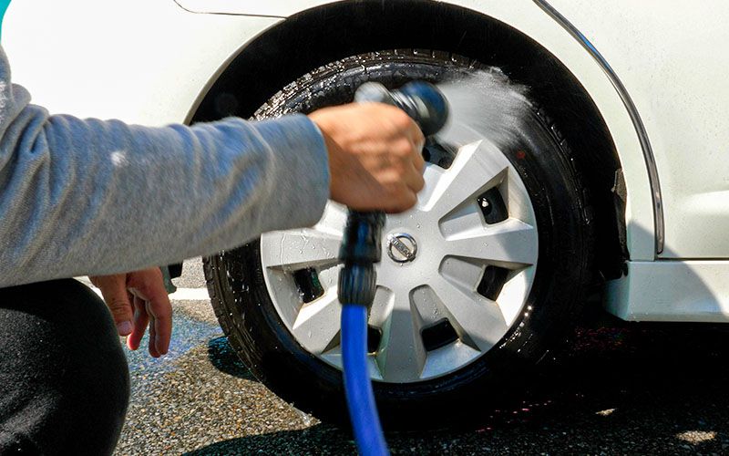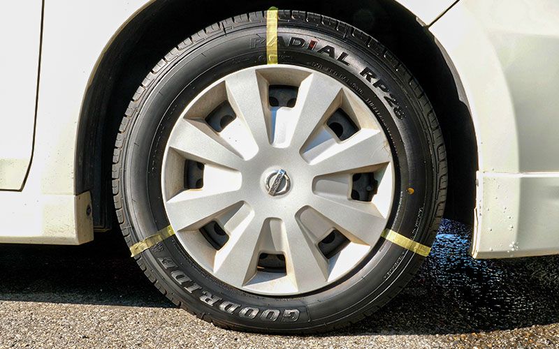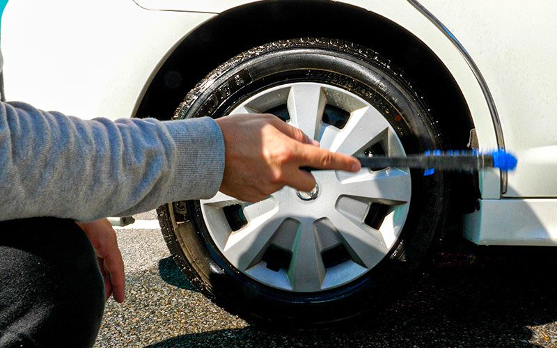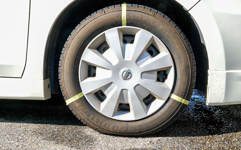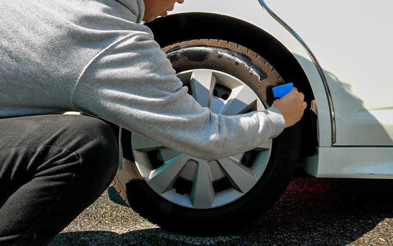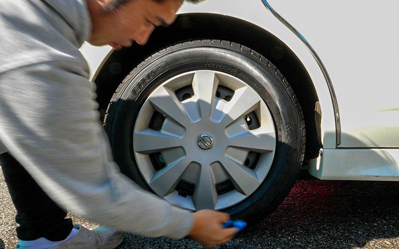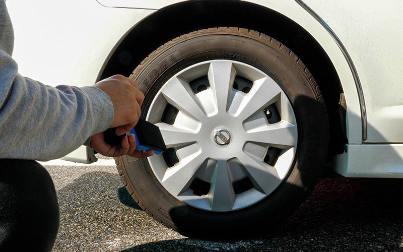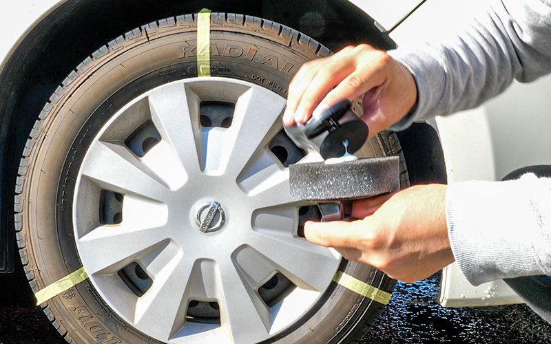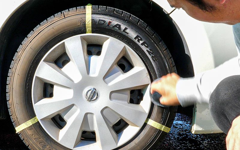 ①タイヤの油汚れ・泥汚れを落とし、水気を取る。