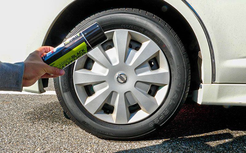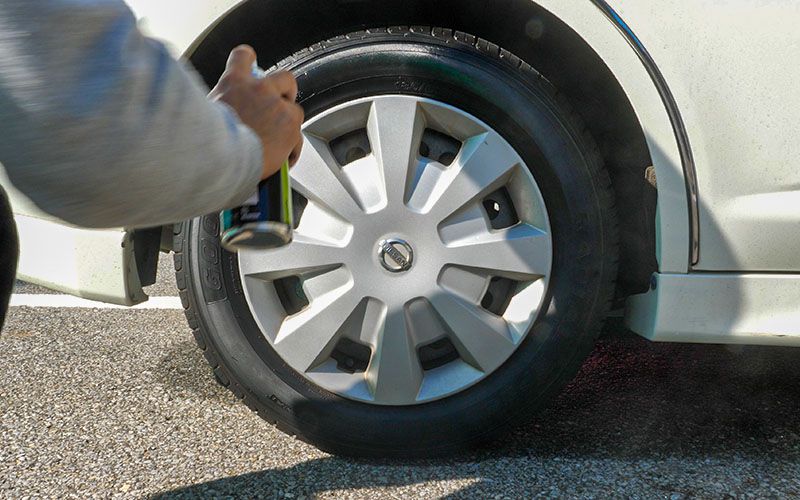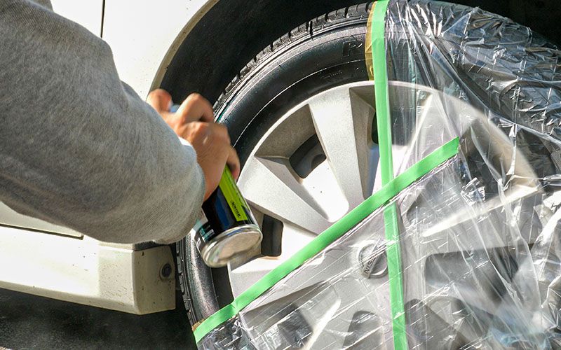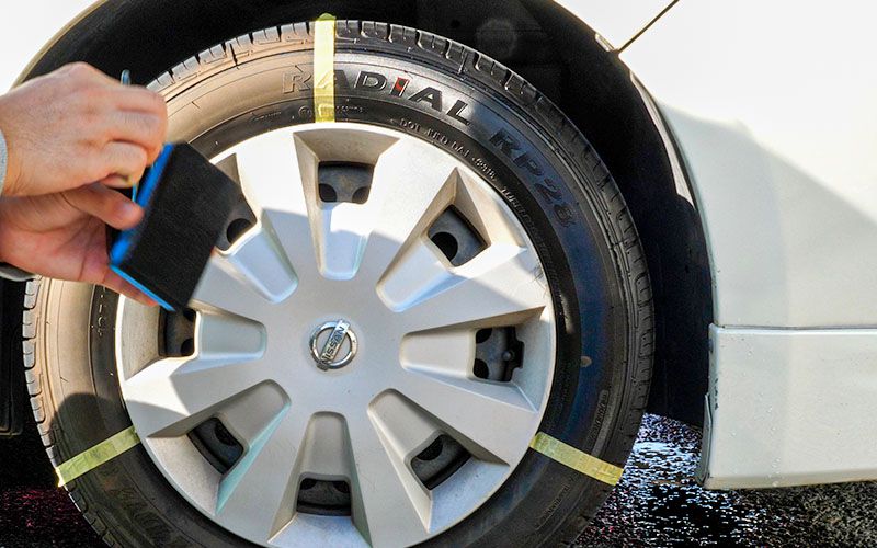 ③タイヤの側面から10~20cm離して上塗り剤をムラなく吹きかける。
