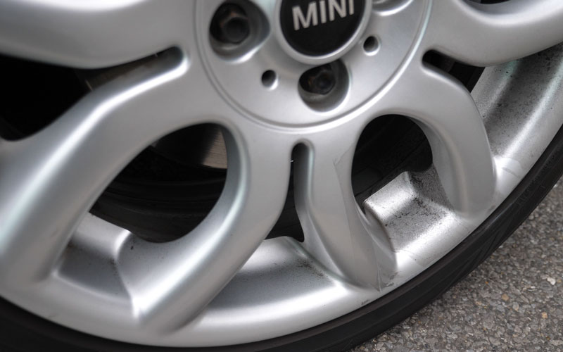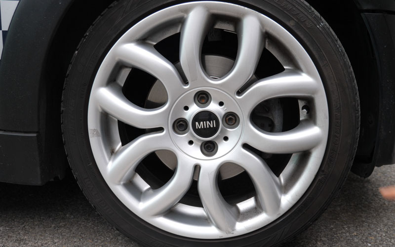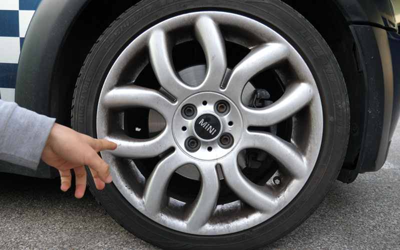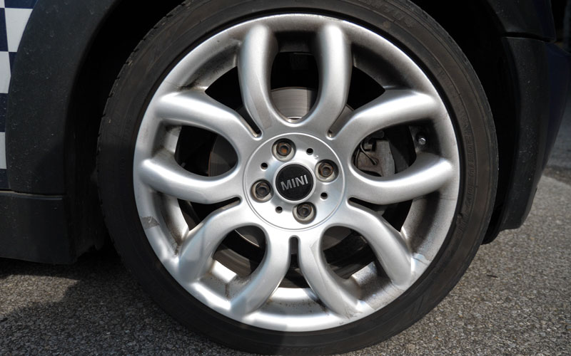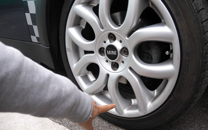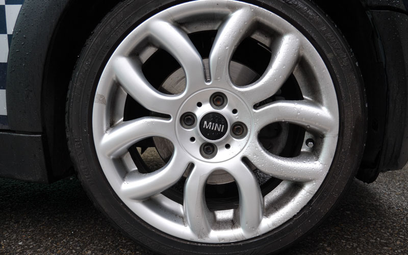 ホイールが乾いたので、MINIのマークを中心に十字に4等分する形でマスキングテープを貼りました。ここから3種類のホイールコーティング剤をそれぞれ施工していき、余った場所は未施工のままで経過を見ていきます。