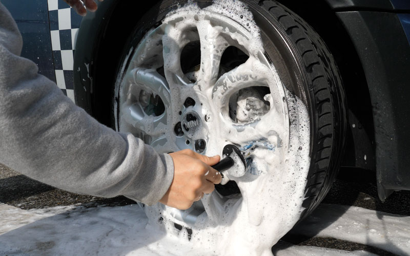 (複雑な形状のホイールや拭き取りにくい細部には、直接噴霧せず、クロスに液剤を染み込ませて塗布してください。拭き残した液剤に汚れが付着すると、取れにくくなることがあるので、注意してください。)